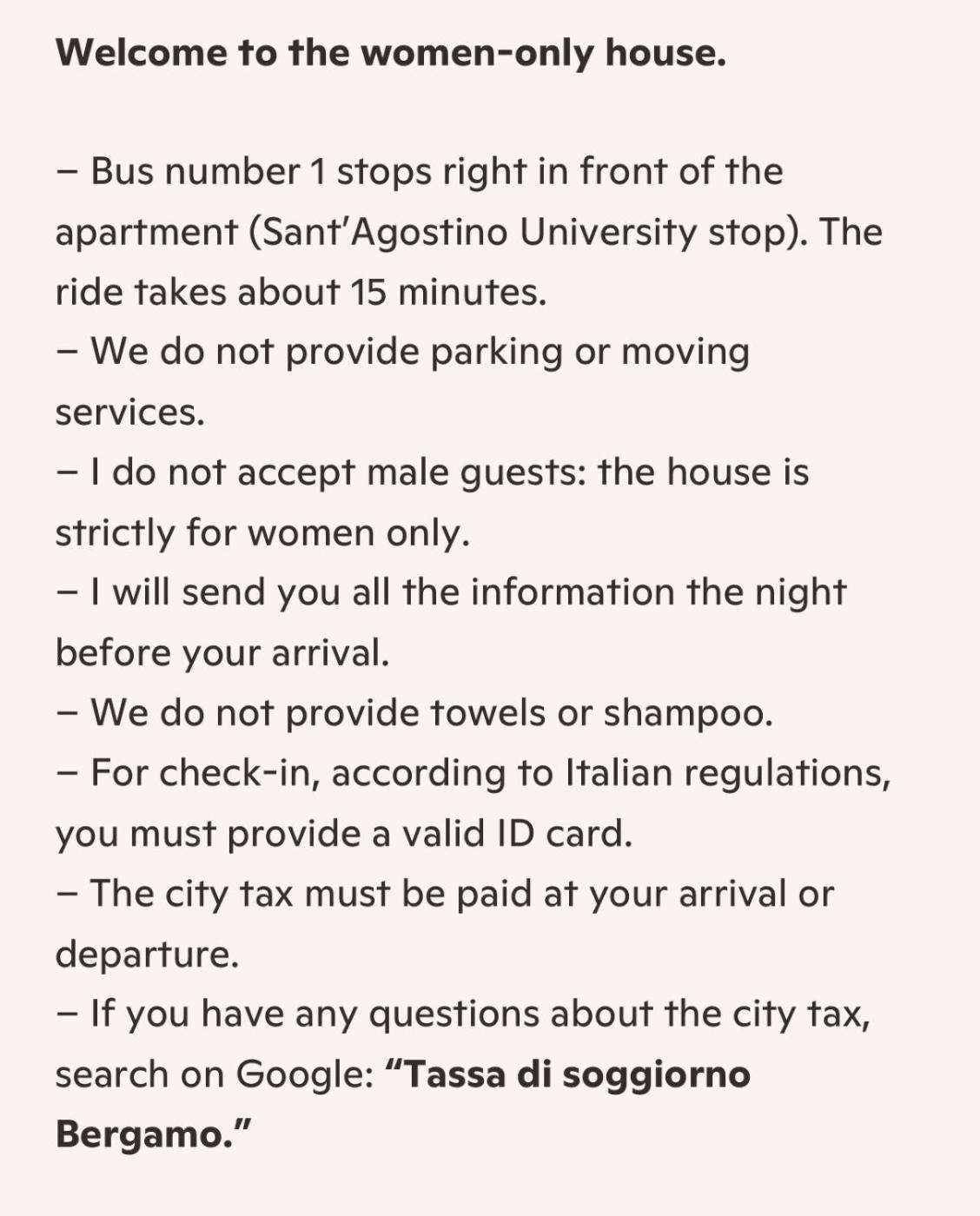 Located in Bergamo within 800 metres of Accademia Carrara and 1.2 km of Bergamo Cathedral, Just women solo donne non accetiamo gli uomi provides rooms with free WiFi. The property is around less than 1 km from Teatro Donizetti Bergamo, a 15-minute walk from Church of Santa Maria Maggiore and 7.3 km from Orio Center. Fiera di Bergamo is 7.3 km away and Centro Commerciale Le Due Torri is 10 km from the apartment.