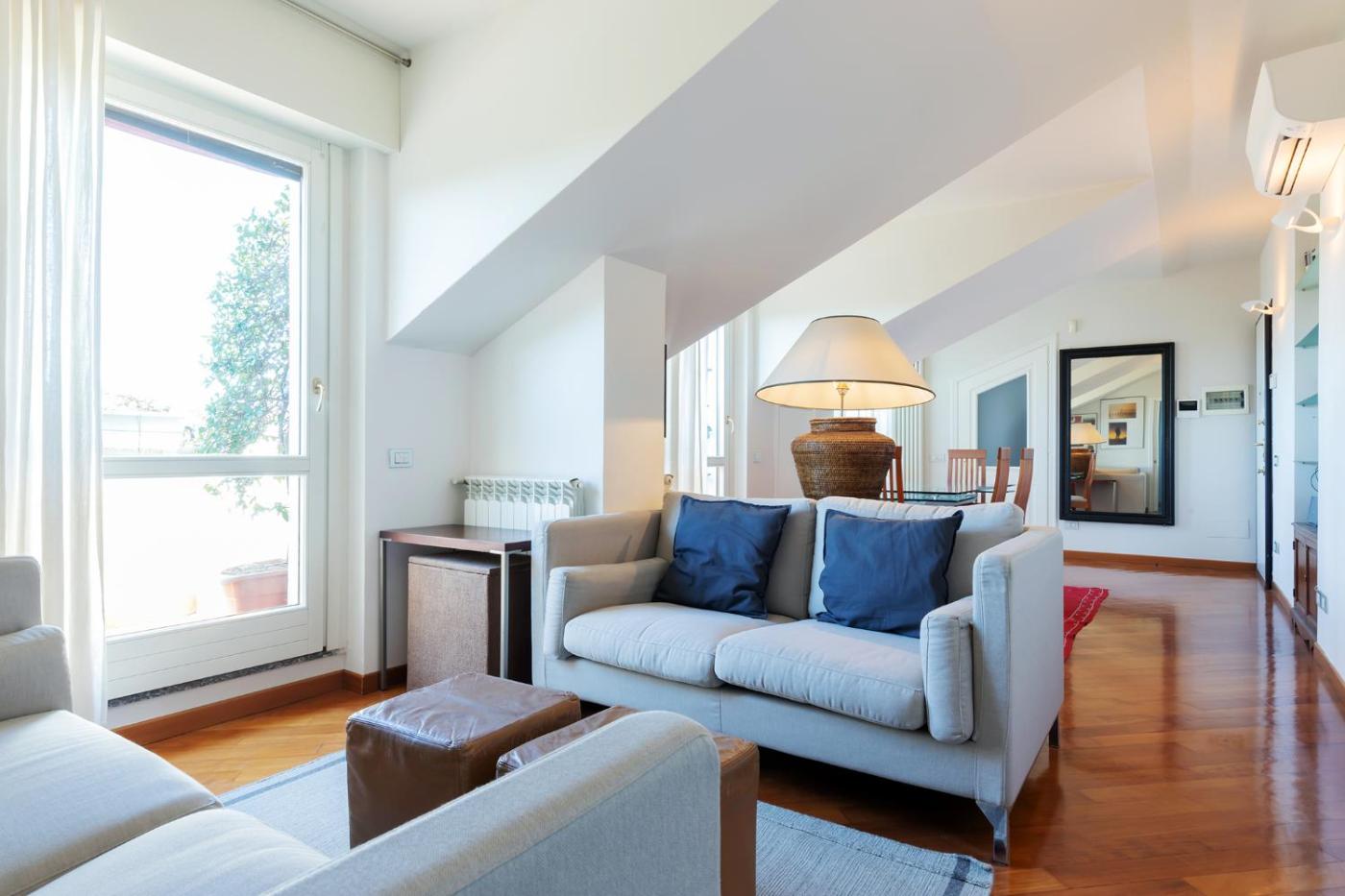 Two-Bedroom Deluxe Apartment with Balcony - Via Varese 4. This spacious apartment includes 1 living room, 2 separate bedrooms and 2 bathrooms with a shower and free toiletries. Guests can make meals in the kitchenette that is fitted with a stovetop, a refrigerator, a dishwasher and kitchenware. This apartment is air-conditioned and has a seating area with a flat-screen TV, a washing machine, a tea and coffee maker, a dining area, as well as a wardrobe. The unit has 4 beds.