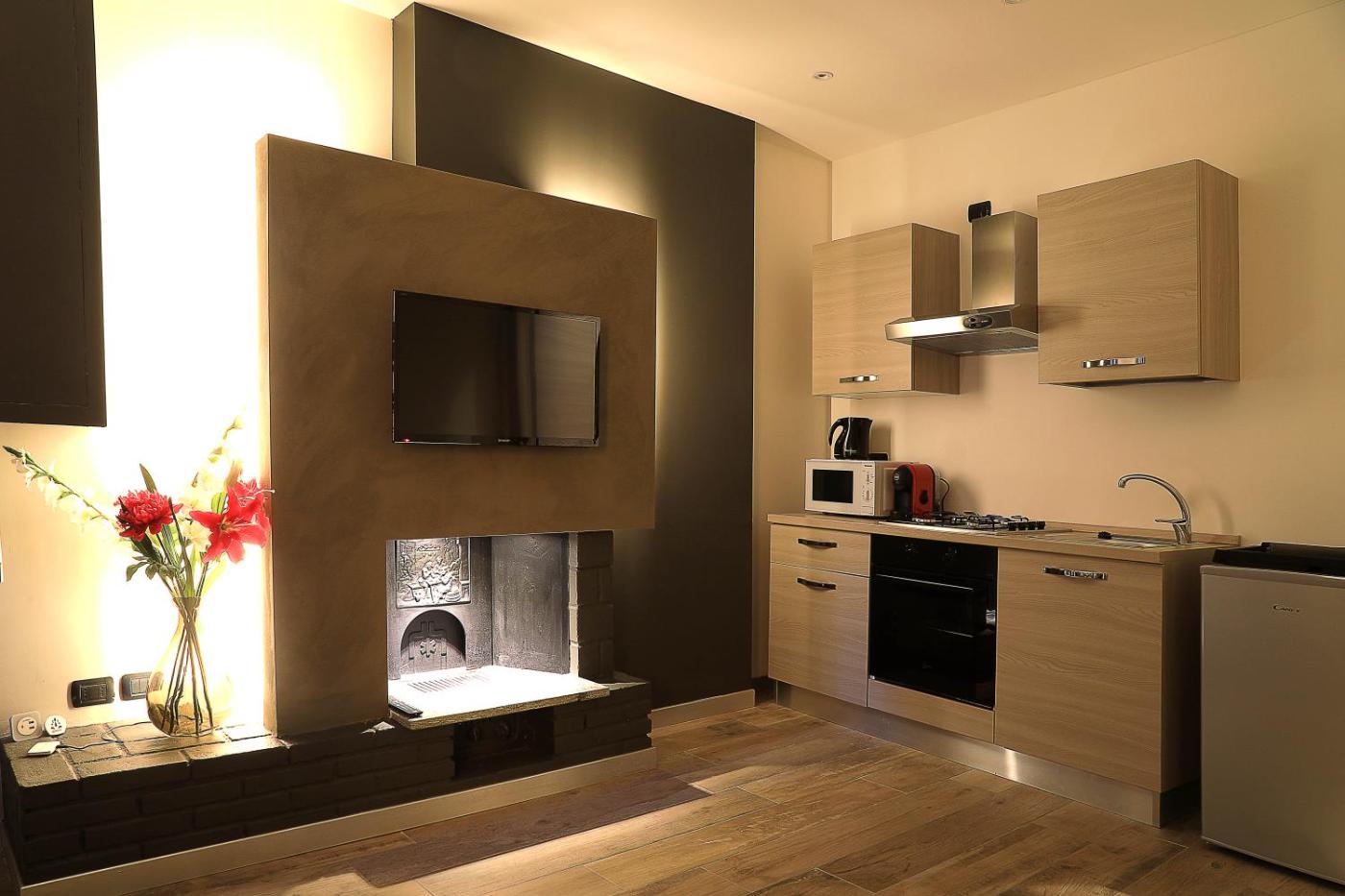 One-Bedroom Apartment. Guests will have a special experience as the apartment provides a fireplace. This apartment consists of 1 living room, 1 separate bedroom and 1 bathroom with a bidet and free toiletries. Guests can make meals in the kitchen that is equipped with a stovetop, a refrigerator, kitchenware and an oven. The apartment features parquet floors, a seating area with a flat-screen TV with cable channels, air conditioning, a washing machine, as well as a coffee machine. The unit offers 2 beds.