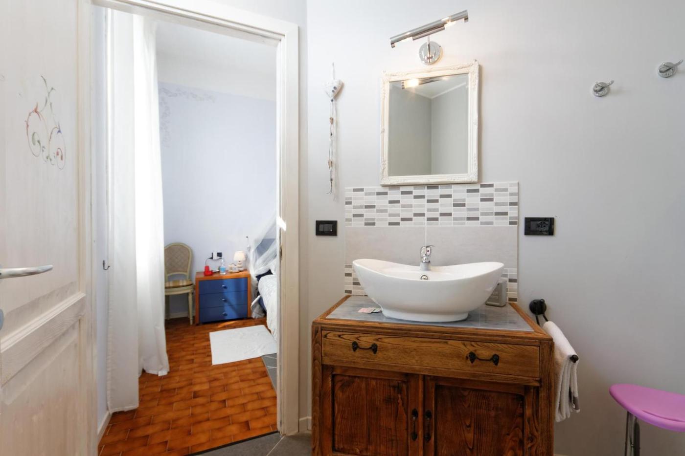 Double Room. This room has white furniture and shares a balcony with the other room. It has a private bathroom. ;