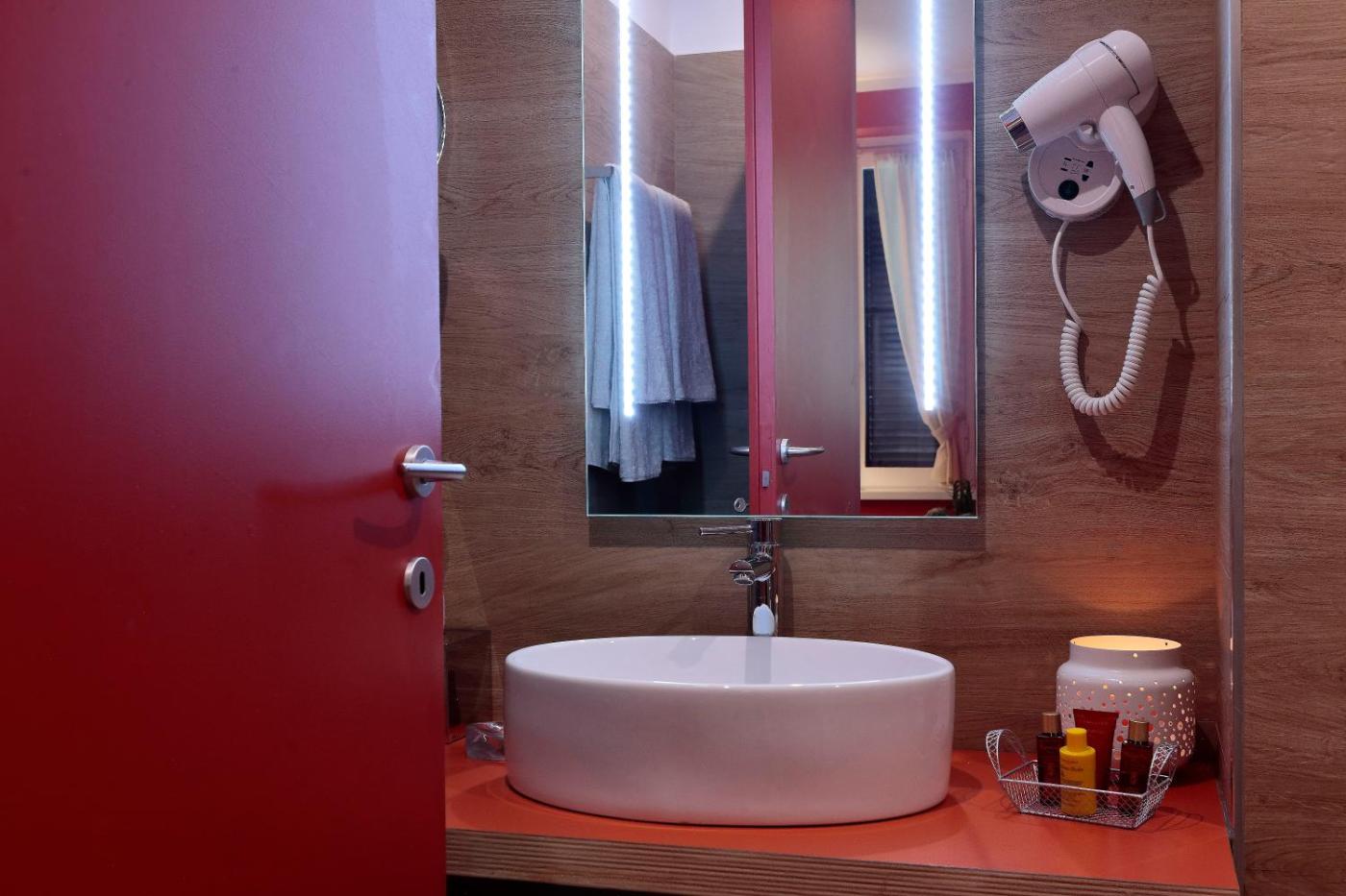 Deluxe Double Room. This double rooms standout feature is the pool with a view. Offering free toiletries and bathrobes, this double room includes a private bathroom with a walk-in shower, a bidet and a hairdryer. The air-conditioned double room offers a flat-screen TV, soundproof walls, a tea and coffee maker, a wardrobe as well as garden views. ;